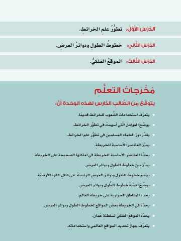 ُعلم 17 ِ اخلرائط َّ .. الت ُطور َّ الت ُّ اريخي و ُ إحداثيات ِ املوقعَ ْن:َّ يتوق ُع ِ م َن َّ الط ِ الب َّ الد ِ ارس ِ لهذه َ الو ْح ِدة أ ال�ش ِ عوب ِ للخرائط ً قديما.ُّn َّ يتعر َف ا�س ِ تخداماتُّ في تطوِر ِ الخرائط.n ِّ يو�ض َ ح العوامل َّ التي أ�س ْ همتُّ في تطوِر ِ علم ِ الخرائط.n ِّ يقدَر َ دور ِ العلماء الم�س َ لمينn ِّ يميَز العنا�صر الأ�سا�س ِ ية للخريطة.n ِّ يحدَد العنا�صر الأ�سا�س ِ ية للخريطة في أماكنها ال�صحيحة على الخريطة.n ِّ يميَز َ بين ِ خطوط ِ الطول ِ ودوائر ِ العر�ض.n ير�س َم َ خطوط ِ الطول َ ودوائر ِ العر�ض الرئي�س َة ِ على �شكل ِ الكرة الأر�ضَّيِة. الط ِول ِ ودوائر ِ العر�ض.ُّn ِّ يو�ض َح ِّ أهم َية ِ خطوطn يحدد المناطق الحرارية على خريطة العالم.n ِّ يحدَد ِ في الخريطة َ بع�ض ِ المواقع ِ لخطوط ِ الطول ِ ودوائر ِ العر�ض.n ِّ يحدَد َ الموقع َّ الفلكي ل�س ِ لطنة ُ ع َمان. n َّ يتعر َف َ جهاز ِ تحديد ِ المواقع العالمي وا�س ِ تخداماتِه. التعل ِمُُّم ْخَر ُ جاتر ِ علم ِ اخلرائط.ُّ تطوَُّ الدْر ُس َ األ َّو ُل:خطوط ِ الطول ُ ودوائر ِ العر�ض.َُّاني:َّ الدْر ُس الثُ الموقع ُّ الفلكي.َّ ِال ُث:َّ الدْر ُس الث