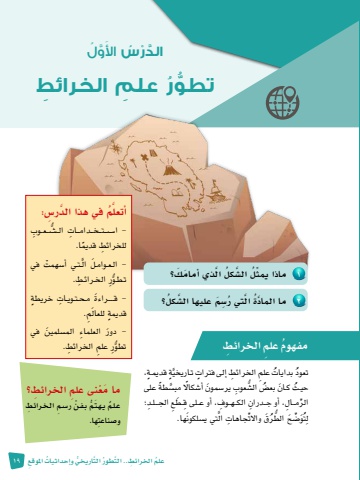 ُعلم 19 ِ اخلرائط َّ .. الت ُطور َّ الت ُّ اريخي و ُ إحداثيات ِ املوقعو ُلَّ الدْر ُس َ األ َّر ِ علم ِ الخرائطُّ تطوَُّ ٍة قديمـٍة، ُ بدايات ِ علم ِ الخرائط ٍ إلى فترات تـاريخيتعودَُّ ًطة على ُّش ِ عوب ير�س َ مون أ�ش ًكال مب�سض ال�ُث كـ َان بع�حيـُِّ الرمــ ِال، أو جــ ِ دران الكــهــ ِوف، أو عــ ِ لى قــ َطِع الجـــلـ ِد؛ التي ي�س َ لكونها.َّت ِ جاهاترَق واالِّ الطُُّ�ض َحَ ِّتوُِلمفهوم ِ علم ِ الخرائطُم بف ِّن ر�س ِم الخرائ ِط َ ما مْع ِ نى علم ِ الخرائط؟ُّعل ٌم يهَتو�ص ِ ناعتها. الذي َ أمام َك؟َّكلُ ال�شَّلُ ماذا يمثِّ1كل؟ُ عليها ال�شَِّس َم ال ُ تي ر�َّةُ ما المادَّ2 في هذا الدر�ِس: َّمَّ أتعل ُ ال�����ش ِ ��ع��وبُّ- ا���س ِ ��ت��خ��دام��اتِ للخرائط ً قديما. ال�ت�ي أ�س ْ همت في ََّ - ال�ع�وام�لُِّر الخـرائـ ِط.تـطـو- ق��ـ َ ��راءة ِ م�ح�ت�وي�ات ٍ خريطةٍ قديمة َ للعال ِم. َ - دور ِ العلماء الم�س َ لمين في ُِّر ِ علم ِ الخرائط.تطو