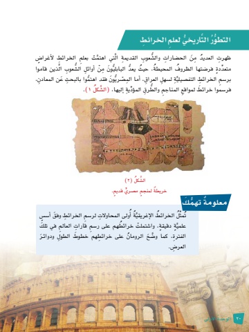 ال َّ تي اهتمْت ِ بعلم ِ الخرائط لأغرا�ٍضَُّّش ِ عوب ِ القديمةِ ظهرت ُ العديد ِ مَن الح�ض ِ ارات وال� الذين قاموا َُّّش ِ عوبُّ َون ِ مْن ِ أوائل ال� يعد البابليُّ، حيث المحيطة ُُتها الظروفمتعد ٍدة فر�ض ُِّ فقد اهتم ِ وا بالبحث َ ع ِ ن المعادن، ُُّّ َونَّ ِة ل�س ِهل ِ العراق، ِ أما الم�ص ْ ريبر�س ِم ِ الخرائط التف�صيليكل 1.)َّش ُؤد ِية إليها، )ال� والط ِرق الم ُِّّفر�س َ موا خرائط ِ لمواقع ِ المناجمكل )2)ال�َّش ُ م�صري ٍ قديم.ٌ خريطة ٍ لمنجم ٍّ الت ُّ اريخي ِ لعلم ِ الخرائطَّرُّ التطوُ20 َ الو ُحدة الأوىلولى المحاوالِت لر�س ِم ِ الخرائط َ وفق أ�س ٍ�سُة أَُّ الخرائط الإغريقيُلُمثِّتُ خرائطهم على ر�س ِم ِ قارات ِ العالم َ في تلكَُّ ٍة ٍ دقيقة، وا�ش ْ تملتعلميُ الرومان ِ على خرائط َ هم خطوط ِ الطول َ ودوائ�رِ الفترة َّ ، كما و�ض َحالعر�ِض.معلومة ُّ تهم َكٌ