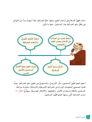 22 َ الو ُحدة الأوىل عدد ِ مَن ِ العواملٌ�س َ اعد ُ ظهور الإ�س ِالم ِ في ازدهار ِ العلوم ِ ، ومْن ُ ها: علم ِ الخرائط َ ، وقْد أ�س ْ همتُِّر ِ علم ِ الخرائط َ عند الم�س َ لمين، منها ما يأتي:في تطوارتباط ِ العديد مَن ِ العباداتُإِ في ال�س ِالم ِ بتحديد ِ الوقتواال ِ تجاهات.ات�س ُاع م�س ِ احة َّ الد ِ ولةَِّّ ِة.الإ�سالمي الت ِّ جاري الن�ش ِ اط َُِّّ ازدهارَّ ِة.َّ والر ِ حالت الجغرافي ات�صـ ِالِّتعريب ِ العلوم َ نتيجةُُّش ِ عوبالـمـ�سلـمـ َين بال�الأخـرى.، حيثعودي ِ في تطوير ِ علم ِ الخرائط ُي، والم�س ِّ، مثل: الإدري�س ُُِّّ َون الم�س َ لمونأ�س َهم الجغرافي خرائطَُّ ْزتَّ ِة، وتميَّ ِة ُّ والرومانيِ قاموا بت�صحيح ِ المعلومات ِ الواردة ِ في الخرائط الإغريقيكل )2)ح ال�َّش ُ، ويو�ضَُِّّ ِةالم�س َ لمين ِّ بالد ِقة وا�س ِ تخدام ِ الألوان ِ ، والخطوط، والأ�ش ِكال الهند�سيُّ َون الم�س َ لمون. التي ر�سَمها الجغرافيَِّ إحدى الخرائط