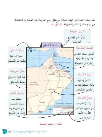 ُعلم 25 ِ اخلرائط َّ .. الت ُطور َّ الت ُّ اريخي و ُ إحداثيات ِ املوقع الم ِ ختلفة، ْ َر الح�ض ِ ارات ُُِّر ر�س ِم َ الخ ِ ريط َ ة عب العلماء ِ في الوقت ِّ الحالي من تطووقد ا�س َ تفاد ُكل 4.)َّش ُفي و�ضِع َ عنا�صر أ�سا�س ٍية ِ للخريطة، )ال�كل )4 )عنا�صر الخريطةال�َّش ُ ع َ مانة ََُُسلْ َطنْ َخ َ ريطِة: ُ نوان العُْ ِضوعل َ ع َ لى موُّدَ ُ يْ َخ َ ريطِة.الَُّة:ْ ُجْغرافيُ الَ ْسماءاأل الظ ِ واهِرَ ََّ ْسماءوضُح أُ ِّ تِةَّْ ُجْغرافيْ َم ِواقِع الَوالْ َخ َ ريطِة.ْ ِوارَدِة في ال الْ َخ َ ريطِة:موز الُ ُرَ ْش ٌ كال َ و ُخ ٌ طوطأُ َ عِنِّرُعبِ َفٍة تَلْ ٍوان ُ م ْختِبَألِة. َّْ ُجْغرافيالظ ِ واهِر الَّْ َخ َ ريطِة:ُ فتاح الِمْ ٍ لوماتم ُن َ معَ َضََّت يْ َخ َ ريطِة َ وَد ِ الالتَعِن الُّ ِ موزْ ِوان َ والرَلاْلْ ِوارَدِة فيها.الَّ ْسِم:ِم ْق ُ ياس الرُ ِساع ُد َ على يْ ِ قياساتِْرَفِة الَمعْ َخ َ ريطِة َ وما َعلى الِة.َها في الطبيعُ ِقابلُ َّيْ َخ َ ريطِة:ُ الِإطارْ ُ م ْزَدَوٌجَوٌَد أط ُ م ْفرٌَّ خَ َ خريطِة.ْلُ ُ حيط ِ باي الش ِمال:ُ ََّةِإشارُ ِ إ ِ لى ج َهِةُشير تْ َخ َ ريطِة.الش ِمال في الَّ