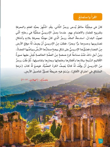 28 َ الو ُحدة الأوىلِّ ِه ِ للعلم ِ والمعرفةتِهَر بحب الث َ اني، وقِد ا�ْشَُّدعى روجرُ يَّ َة ٌ حاكم ُليَِّكان ِ في �صِق التي ََّّ َة ِ في رحلتِه �صقليُّ ِِّ وتقريبِه ِ للعلماء واال ِ هتمام ِ به َ م. عندما و�صل الإدري�سي مهتم ِ ا بمعرفة ِ بالدِه وأ�ش ِكال ال َ ذي كان ًَّّ روجر الملك ُُتدعاهُ تجوب َ البلدان، ا�س ُه َ موقع الأر�ِضَُ ْن ِ ي�ص َف َ لّ أِس ِ ها وحدود ًّ ها بر ً ا وبحر َ ا، فطلب ِ مَن الإدري�سيت�ضاري�اء، ُ وبيا�ضها الف�ض ُضُّ على �ش ِكل بي�ضٍة ُ �صفارها الأر�ََُّ َرها الإدري�سيِمَن الف�ض ِاء ف�ص َ وُ عليها �صورة نِق�َشَُّ الف�ضِة ِ الخال�صة �صناعة ٍ كرة �ض ٍخمة ِ مَنُ تمْتِومْن ِ أجل َ ذلك َّ روجرُم َ طَل َبها، ث ََُّّ ِ بعة ِ ببالدها و ِ أقطار ِ ها وخلجان ِ ها وبحار ِ ها وتفا�صيلِ الأقاليم ال�سه َ كتاب ِ )نزهةَُّ َة، فو�ضَع َ لف َ الكرة ِّ الف�ضيَُ ِ�صًا يه كتابُؤل َف َ لِّْن يَّ أِمَن الإدري�سير َ تفا�صيل الأر�ِض.ُالم�ش ِ تاق ِ في اختراق ِ الآفاق َ (، ور�سَ َم ِ فيه ً خريطة ِّ ت�صوُّ بت�صر ٍف: )الهالوي، 2012)ْ وا�س ْ تمتعاقرأ28