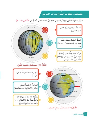 32 َ الو ُحدة الأوىل الط ِول. ُّص ِ خطوطُكل )6 )خ�صائ�َّش ُال�ص ِ دوائر العر�ِض . ُكل )7 )خ�صائ�َّش ُال�َّشكلين: )6 ،7.)ح في ال� تت�ضَُّ الط ِول ُ ودوائر العر�ِض ٍ بعدد ِ مَن ِ الخ�صائ�صُّ خطوطُزَُّتتمي الط ِول ِ ودوائر ِ العر�ضُّص ِ خطوطخ�صائ�ُى خطَّ َّ ي�سمالخط الرئي�سُُّهُ (، ودرجتُجرينت�ش )Greenwichٌ.�صفر خطا، منها )180 )ًّعددها 360ُ خط جرينت�ش، و)180 )ِّخطا �ش َرقًّ خط جرينت�ش. ِّخط َ ا غربًّجرينتشخطَّ جرينت�شٍة تلتقي ََّ وهميُ أن�صاف دوائرَعند ِ القطبين.مدرسة أنوار الحكمة مدرسة أنوار الحكمةمدرسة أنوار الحكمة مدرسة أنوار الحكمةط بالـكـ ِرةلة تـحـيـُيِة. ُ دوائر مـكـتمـ ٌالأر�ضَّمى ة ت�سـ َّرة الرئيـ�سـُُ (، ودرجت ٌ ها �صفر. الــدائـ ُ)دائـ َرة اال�س ِ تواءعددها 180 ً دائرة، منها )90 )ًُ دائرة �ش َمال ِ دائرة اال�س ِ تواء، و)90 )ً دائرة َ جنوب ِ دائرة اال�س ِ تواء.