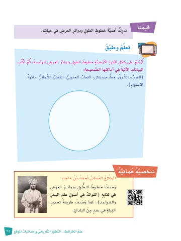 ُعلم 35 ِ اخلرائط َّ .. الت ُطور َّ الت ُّ اريخي و ُ إحداثيات ِ املوقعُ قيمناَّ َة ِ خطوط ِ الطول ِ ودوائر العر�ِض ِ في حياتنا.ك أهميُِ ندرةٌَّ ماني عة ٌُيَّ�شخ�صلُح ُ الع ُّ ماني ُ أحمد ْ ب ُن ٍ ماجد:َّالم ال�ط ِ �ول َ ودوائ��ر العر�ِضَُّو��ص َ َ �ف َ خ�ط�وطُ )الفوائد في ِ أ�صول ِ علم ِ البحرِ في كتابِهَ وال�ق�واع�د(، كما و��ص َ َ �ف َ طريقة ِ تحديدِ الق ِ بلة ٍ في عدد ِ مَن ِ البلدان.ِّ وطب ْقتعل ْمَّت ِبم ْ اكُ، ث ََُّّ ِة َ خطوط ِ الطول َ ودوائر العر�ِض الرئي�سَةاْر�سُ ْم على �ش ِكل ِ الكرة الأر�ضيُِ البيانات َ الآتية في ِ أماكنها ال�ص َّ ِ حيحة: ، دائرةُّ َُّشماليُّ ُ ، القطب ال�ُ ، القطب الجنوبي، خط جرينت�شُّرقَّش ُُ )الغرب، ال�اال�س ِ تواء(.