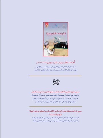 ِّل َف هذا الكتاب بموجب القرار الوزاري 219 /2021 مُأتم إدخال البيانات والتدقيق اللغوي والر�سم والت�صميم والإخراج في مركز إنتاج الكتاب المدر�سي بالمديرية العامة لتطوير المناهج.جميع حقوق الطبع والتأليف والن�شر محفوظة لوزارة التربية والتعليمً أو ترجمته أو وال يجوز طبع الكتاب أو ت�صويره أو إعادة ن�س ً خه كامال أو مجزأتخزينه في نطاق ا�ستعادة المعلومات بأي �شكل من الأ�شكال إال بإذن كتابي م�سبق من الوزارة، وفي حال االقتبا�س الق�صير يجب ذكر الم�صدر.جميع خرائط �س ُ لطنة عمان الواردة في الكتاب تم مراجعتها من قبل الهيئة الوطنية للم�ساحةال يعتمد على الخرائط الواردة في الكتاب كمرجع للحدود الدولية وال�سيا�سية والإدارية، والخرائط التاريخية تخطيطية، وهي لال�ستخدام التعليمي فقط .