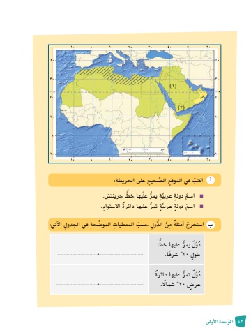 42 َ الو ُحدة الأوىل عليها خطُّ يمرل ٌُّدَوُ.................................،.............................. ٍطول 30� °ش ًرقا.ُ عليها دائرةل ُّ تمرٌدَوُ.................................،............................... عر�ٍض 20� °ش ًمال.)2))1)أ ْ اكتب ِ في الموقع ال�ص َّ ِحيح ِ على الخريطة:يها خط جرينت�ش. ُّ يمر َ علَّ ٍة ُّn ا�س َم ٍ دولة عربيُ عليها دائرة اال�س ِ تواء.َّ ٍة ُّ تمرn ا�س َم ٍ دولة عربي الد ِول ح�س َب ِ المعطيات َّ المو�ض ِحة ِ في الجدول الآتي:ُّب ا�س ْ تخرج ً أمثلة ِ مَن