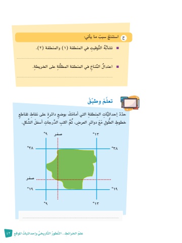 ُعلم 43 ِ اخلرائط َّ .. الت ُطور َّ الت ُّ اريخي و ُ إحداثيات ِ املوقعِّ وطب ْقتعل ْمَّأمام َك بو�ضِع ٍ دائرة ِ على نقاط ِ تقاطعَّ ِات ِ الم ِ نطقة التي َّحدْد إحداثيَّش ِكل.م ِ اكتب َّ الد ِ رجات أ�س َفل ال�، ث َُّ مَع ِ دوائر العر�ِض الط ِول َُِّ خطوط..................................................................................................38 °38°13°13°�صفر 9°�صفر9°19 °19°ج ا�س ْ تنتج �س َبب ما يأتي:َّ الت ِ وقيت في المنطقة )1 )والمنطقة )2 .)هn ت�ش ُابُ.................................................................................................. في المنطقة المظل ِلة ِ على الخريطة. َّ الم ِ ناخاعتدال ُُn..................................................................................................