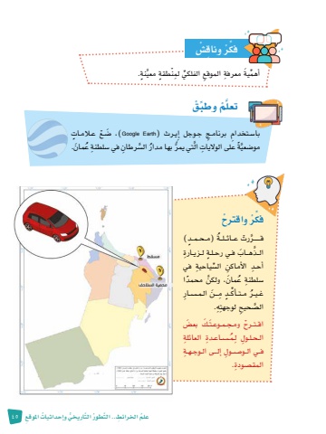 ُعلم 45 ِ اخلرائط َّ .. الت ُطور َّ الت ُّ اريخي و ُ إحداثيات ِ املوقعَّ ٍنة.أهم َية ِ معرفة ِ الموقع ِّ الفلكي ِ لمْن ٍطقة معيِّفك ْر ِ وناق�ْشِِّّ وطب ْقتعل ْمَّْ عـالمـ ٍاتبا�سـ ِ تخدام برنامـ ِج جـوجل إِيـرث )Earth Google� ،) َ ضـع ع َمان.َّ ِ رطان في �س ِ لطنة ُُ بها مدار ال�س ال ُّ تي يمرََّّ ًة على الوال ِ ياتمو�ضعيفك ْر ْ واقترحِّ ع��ائ��ل��ة ٍ )م��ح��م��د( َُّ ق�������ر ْرتال��ذ َ ه��اب ٍ ف�ي رح�ل�ة ِ ل�زي�ارةَِّ أح�د ِ الأماكن ال�سِّ ِ ياحية في ع َمان َّ ، ولكن ً محمدا �س ِ لطنة ُِّ أك ٍ ��د ِ م َ ��ن ال�م���س ِ �ارُ غ�ي�ر م��ت��ال�ص َّ ِحيح ِ لوجهتِه. ْ اق��ت��رح َ وم�ج�م�وع�ت َ �ك بع�َض�م���س ِ �اع�دة ِ العائلةِ ال�ح�ل�ول ِ لُِ ف�ي ال�و��ص�ول ِ إل���ى ال�وج�ه�ةِ المق�صودة.