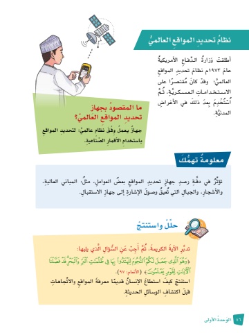 46 َ الو ُحدة الأوىلُ الأمريكيةزارة ِّ ال�د ِ ف�اعُْ أطلقت َ وَعام 1973 َ م نظام ِ تحديد ِ المواقع م ً قت�صرا على َّ ْ ؛ وقد َ كان ُالعالمي�م، ث ََُّّ ِ �ةاال��س ِ �ت�خ�دام�ات ال�ع���س�ك�ريت ْخِدَم ِ ب َعد َ ذلك في الأغرا�ِضُْا�سَُّ ِة.المدنيُ نظام ِ تحديد ِ المواقع ُّ العالميود ِ بجهازُما المق�صِ تحديد ِ المواقع ِّ العالمي؟ ٌ جـهـاز ُ يـعـمل ِ و ْف َ ـق ٍ نظام ٍّ عالمي ِ ؛ لتحديد ِ المواقع ال�ص ِ ناعية. با�س ِ تخدام ِ الأقمار ِّ، مثل ِ : المباني العالية، ُض ِ العواملُ في دق ِ �ة ِ ر�صد ِ جهاز ِ تحديد ِ المواقع بع�َّرؤثُِّتعيق َ و�صول الإ�ش ِ ارة ِ إلى جهاز اال�س ِ تقبال.والأ�ش ِجار ِ ، والجبال ُ التي ت ُحل ْل وا�س ْ تنتجِّ الذي يليها:َُّّ ِ ؤالَ ِج ْب َ عِن ال�سم أ، ث ََُّّ ِر َ الآية َ الكريمةتدب{ڄڃڃڃڃچ چچچڇڇڇڇڍ ڍڌڌ} )الأنعام: 97 .)ت ِ جاهاتا�س ْ تنتج َ كيف ا�س َ تطاع الإن�س ُان ً قديم َ ا معرفة ِ المواقع واالَِّ قبل اكت�ش ِ اف الو�س ِ ائل ِ الحديثة. معلومة ُّ تهم َكٌ