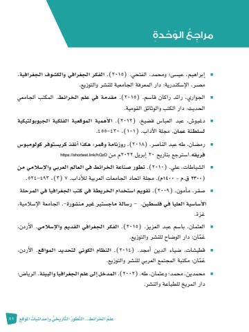 ُعلم 51 ِ اخلرائط َّ .. الت ُطور َّ الت ُّ اريخي و ُ إحداثيات ِ املوقعn إبراهيم، عي�سى؛ ومحمد، الفتحي. )2015 .)الفكر الجغرافي والك�شوف الجغرافية. م�صر، الإ�سكندرية: دار المعرفة الجامعية للن�شر والتوزيع.n الجواري، رائد راكان قا�سم. )2015 .)مقدمة في علم الخرائط. المكتب الجامعي الحديث: دار الكتب والوثائق القومية. n دغبو�ش، عبد العبا�س ف�ضيخ. )2012 .)الأهمية الموقعية الفلكية الجيوبولتيكية ل�سلطنة عمان. مجلة الآداب، )101 ،)430-455 .n رم�ضان، طه عبد النا�صر. )2018 .)روزنامة وقمر: هكذا أنقذ كري�ستوفر كولومبو�سفريقه.ا�سترجع بتاريح 20 إبريل 2022م من hQzD/link.shortest://httpsn ال�شباطات، علي. )2010 .)تطور �صناعة الخرائط في العالم العربي والإ�سالمي من )2300 ق.م - 1400م(. مجلة اتحاد الجامعات العربية للآداب. 7( 3 ،)493-524.n� صقر، مأمون. )2009 .)تقويم ا�ستخدام الخريطة في كتب الجغرافيا في المرحلة الأ�سا�سية العليا في فل�سطين. - ر�سالة ماج�ستير غير من�شورة-. الجامعة الإ�سالمية، غزة.n العثمان، با�سم عبد العزيز. )2015 .)الفكر الجغرافي القديم والإ�سالمي. الأردن، َعّمان: دار الو�ضاح للن�شر والتوزيع.n قطي�شات، �ضياء الدين أمجد. )2014 .)النظام الكوني لتحديد المواقع. الأردن، َعّمان: مكتبة المجتمع العربي للن�شر والتوزيع.n محمدين، محمد؛ وعثمان، طه. )2002 .)المدخل إلى علم الجغرافيا والبيئة. الريا�ض: دار المريخ للطباعة والن�شر.ِ مراج ُع َ الو ْح ِدة