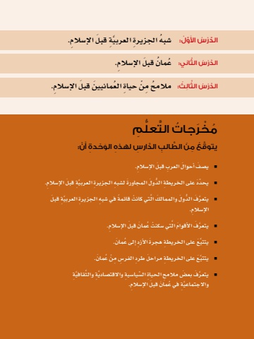 �ش ُبه ِ اجلزيرة َّ العربيِة ُ وع 53ُ مان َ ... قبل ِ الإ�سالمَ ْن:َّ يتوق ُع ِ م َن َّ الط ِ الب َّ الد ِ ارس ِ لهذه َ الو ْح ِدة أn ي�ص َف َ أحوال ِ العرب َ قبل ِ الإ�سالم. الد َول َ المجاورة ل�ش ِبه ِ الجزيرة َّ العربيِة َ قبل ِ الإ�سالم. ُّn ِّ يحدَد ِ على الخريطة الد َول َ والممالك َّ ال ْ تي كانت ً قائمة في �ش ِبه ِ الجزيرة َّ العربيِة َ قبلُّn َّ يتعر َفِ الإ�سالم.n َّ يتعر َف َ الأقوام َّ ال ْ تي �سكنت ُ ع َمان َ قبل ِ الإ�سالم.n َّ يتتب َع ِ على الخريطة َ هجرة ِ الأزد ُ إلى ع َمان.n َّ يتتب َع ِ على الخريطة َ مراحل ِ طرد ِ الفر�س ِ م ْن ُ ع َمان.n َّ يتعر َف بع�َض ِ مالمح ِ الحياة ِّ ال�س ِ يا�سية واالقت�ص َّ اديِة َّ والث َّ قافيِةواال َّ جتماعيِة ُ في ع َمان َ قبل ِ الإ�سالم. عل ِمُّ التَُّم ْخَر ُ جاتَّ العربيِة َ قبل ِ الإ�سالم.به ِ اجلزيرةَُّ الدْر ُس َ األ َّو ُل: �شمان َ قبل ِ الإ�سالم.ُعَُّاني:َّ الدْر ُس الثُ مالمح ِ م ْن ِ حياة ُ الع َ مانيين َ قبل ِ الإ�سالم.َّ ِال ُث:َّ الدْر ُس الث