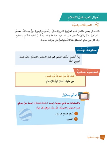 56 َ الو ُحدة ُ الثانية وممالك ُ ؛ فعمانُ( دولٌ، مثل ُ : )ع َمان ِ ، واليمنَُّ ِةْ قامت ِ في بع�ض ِ مناطق ِ �شبه ِ الجزيرة العربي القبيلة َ أحد ِ أنظمة ُ الح ِكم ِ والإدارة، ُُآل ُ الج َ لندى قبيل الإ�س ِالم ِ ، كما كانتمثًل َ كان ُ يحكمها ل َ في جوانب ٍ عديدة.ٌ القات وتوا�صٌْ وقد َ كان َ بين ِ هذه ِ المناطق َ عةُ: احلياة َّ ال�سيا�سيُلًَّ أوِم ْن ِ أنظمة ُ الح ْكِم َ القَب ِّ لي في �ش ِبه ِ الجزيرة َّ العربيِة ُ حكم ِ قبيلةقري�ٍش َّ لمكَة.ُ أحوال ِ العرب َ قبل ِ الإ�سالمةٌَّ ماني عة ٌُيَّ�شخ�صُعبد ِ عِّز ُ بن َ معولة ْ ب ِن �ش ٍم�سِم ِ ن ملوك ُ ع َمان َ قبل ِ الإ�سالم.ِّ وطب ْقتعل ْمَّباال ِ �ستعانة ِ ببرنامج جوجل إيرث )Earth Google ، ْ )ابحث ْ عن ِ موقعل ِ م ْن:ٍّ�ش ِبه ِ الجزيرة َّ العربيِة ُ ، ثَّم ِّ حدْد ِ مو َقع ُ ك1ُ ح ِكم ِ قبيلة قري�ٍش.٢ ِ اليمن.معلومة ُّ تهم َكٌ