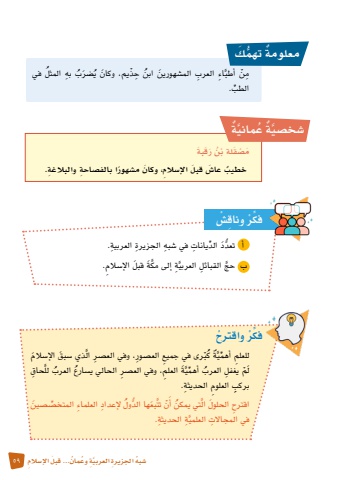 �ش ُبه ِ اجلزيرة َّ العربيِة ُ وع 59ُ مان َ ... قبل ِ الإ�سالم المثل في ُب ِ بهُ ي�ضَرَّ ِاء ِ العرب َ الم�شهورين ُ ابن ِ حْذ َ يم، وكان ُِمْن أطبِّ الطب. ةٌَّ ماني عة ٌُيَّ�شخ�صَم�ص ْ َق ْ لة ب ُن َ رَق َبةٌ خطيب عا�َش َ قبل ِ الإ�سالم َ ، وكان م�ش ً هورا بالف�ص ِ احة ِ والبالغة.فك ْر ِ وناق�ْشِِّّ الد ِ يانات ِ في �شبه ِ الجزيرة ِ العربية.تعدَدأ ُّإلى مكَة َ قبل الإ�س ِالم.ََّّ ِةحج ِ القبائل العربيَّبفك ْر ْ واقترحِّ الذي �س َبق الإ�س َالمَّْ ِ رى في جميع الع�ص ِور، وفي الع�صِر كبُةٌَّأهميِ للعلم ِّ لل ِحاقََّّ َة ِ العلم، وفي الع�صِر الحالي ي�س ُ ارع ُ العربأهميَلْم ِ يغفل ُ العرب ِِّ بركب ِ العلوم ِ الحديثة.ول ِ لإعداد ِ العلماء المتخ�ص ِّ �ص َينُُّ ها الد تت َبعَّْنَ ال ُ تي يمكن أَِّ اقترح َ الحلولَّ ِة ِ الحديثة.في المجاالِت العلميمعلومة ُّ تهم َكٌ