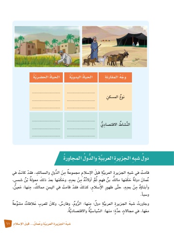 �ش ُبه ِ اجلزيرة َّ العربيِة ُ وع 61ُ مان َ ... قبل ِ الإ�سالم الد ِول ِ والممالك ْ ، فقد ْ كانت في ُّ مجموعة ِ مَنٌَّ ِة َ قبل الإ�س ِالمْ قامت ِ في �شبه ِ الجزيرة العربين �شم�ٍس، ُْ معولة بُه ِ مْن ِ بعدِه َ ، وحَكَم َ ها بعد َ ذلكُدم أوالُ ث َُّ بن ٍ فهمها مالك ُُ دولة َ حَكَمٌع َمانُعين، ممالك ِ ، م َ نها: م ُُ، حت ِ ى ظهور الإ�س ِالم َ ، كذلك ْ فقد ْ قامت ِ في اليمنَّؤه ِ مْن ِ بعدِهوأبنا ُو�سبأ.عةٌٌ القات ِّ متنوس َ ، وكان ِ للعرب َ عُوم، وفار� دول ِ ؛ م ُّ نها: الر ٌَُّ ِةْ وجاورت َ �شبه ِ الجزيرة العربية.َُّة واالقت�صاديَُّ عدٍة؛ منها: ال�سِّ يا�سيََّمعها، في مجاالٍت المجاورةُولُ والدُّدول �ش ِبه ِ الجزيرة َّ العربيِةُْوجُه ِ المقارنة.............................. ُ نوع الم�س ِكن............................................................ُ الحياة الح�ض َّري ُ الحياة ُة َّ البدويُةي�شاط االقت�ص ِادُُّالنَّ..............................................................................................................................................................................................................................................................................