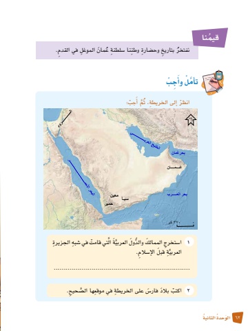 62 َ الو ُحدة ُ الثانية ع َمان ِ الموغل ِ في القدم. ُ قيمناُ نفتخر ِ بتاريخ وح�ض ِ ارة ِ وطننا �س ِ لطنة َُ ِج ْبَّ أمْل وأتَ ْجب:م أ، ث َُّْ ِ إلى الخريطةانظرُعــــمــــانسبـأحميربحر العـــــرب معينبحر ُعمان٠ ٣٧٠ كمشصفحة: 12 ال ْ تي قامت ِ في �شبه ِ الجزيرةََّّ َة1 ا�س ِ تخرج َ الممالك ُّ والد َول العربيَّ ِة َ قبل الإ�س ِالم.العربي....................................................................َس ِ على الخريطة ِ في موقعها ال�ص َّ ِحيح.2 ْ اكتب َ بالد فار�