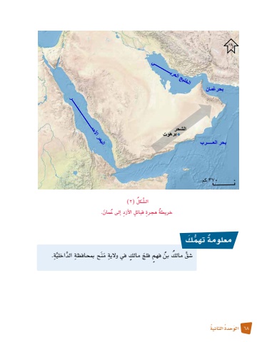 68 َ الو ُحدة ُ الثانيةكل )2)َُّ ال�ش خريطة ِ هجرة ِ قبائل ِ الأزد ُ إلى ع َمان.ُبحر العـــــرببحر ُعمان٠ ٣٧٠ كمشالشحرَّ ِة. مَن ِ ح بمحافظة َّ الداخلي بن ٍ فهم َ فلج ٍ مالك في وال ِية َ مالك ُُ�شقَّمعلومة ُّ تهم َكٌ