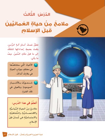 �ش ُبه ِ اجلزيرة َّ العربيِة ُ وع 73ُ مان َ ... قبل ِ الإ�سالم في هذا الد ِر�س: َّمَّ أتعل َُّ ِة، مالمــ َح ِ مـ َن الـحيـ ِاة ال�سِّ يا�سيَّ ِ �ة، ، وال�ث�ق�اف�يََّّ ِ ��ةواالق��ت�����ص��اديَّ ِ �ة ُ ف�ي ع َ �م�ان َ قبلواالج�ت�م�اع�يالإ�س ِالم.َّ ْل نف�س َك َ أم���ام ِ آل��ة َّ ال�ز ِم�ن، تخيَ وقمت ب�ض ِبط ِ إعدادات َ ها لتنقل َكَ إلى ما قبل ِ مئات ال�سِّ َ نين ِ . �ص ْفما يأتي: التي �س ُ ت�شاهدها َ َّالأ�شياءِ في مختلف ِ جوانب ِ الحياةِ في بالد َك َ آنذاك.َ �����ش����ع����ور َك ِ ب���الأ����ش���ي���اءِ ال�م�وج�ودة وبالعي�ِش في َ تلك ِ الفترة.َّ ُ الثَّ الدْر ُس الثن ِ حياة ُ الع ِّ ماني َينْمالمح ِ مَُ قبل ِ اإلسالم
