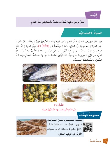 76 َ الو ُحدة ُ الثانية مهم َ في ذلك ْ ، وقد تاجروا ٌّ دور منذ ِ القدم َ ، وكان ِ للموقع ِّ الجغرافي ٌُ الع َ مانيون ِّ في الت ِ جارةَعِمَل َُّ ِة العمانيكل 6 ، ِ )ومَن ِ الموانئ ُُ)ال�شَّحة في َّ ، منها المو�ض ُ الم ِ وانئ ٍ بمجموعة ِ مَن ال�سِّ ِلعْ َر ََعب، مثلُبوبُ ، والح ُمور الت ُِّ عملوا في الز ِ راعة ِ ، وكانت ُّهْمَّأنُِ الم�شهورة ً قديم ُ ا ميناء �س َ مهرم. كما ناعةناعة ِ الفخار، و�ص ُُّ َون ال�ص ِّ َ ناعة، ومنها: �ص ُ العمانيْ َرِز ْ المز ِ روعات َ ، وعرف ُالذ ِرة من أبُّة.َُُّّ ِفن، وال�ص ِّ ُ ناعات المعدنيال�سةَُّ اديالحياة االقت�صُُ م��ي��ن��اء ���س َ ��م��ه��رم ِ م َ ������ن ِ ال��م��وان��ئال�ش ِ هيرة ً قديم ِ ا في محافظة ظفار، َّ ع َمان ِ بموقعه حكومة �س ِ لطنة ُُمَُّوتْهَتِّ الأثري ِ في الوقت الحالي.كل )6)َُّ ال�شُّ َون ً قديما.ِمَن ال�سِّ ِلع َّ ال َ تي تاجر ُ بها العمانيهم منذ ِ القدم. نعتز ِ برموز ِ وطن ُ نا ع َمان ُ ، ونفتخر ب ِ أمجاد ُُّمناُِقَيمعلومة ُّ تهم َكٌ