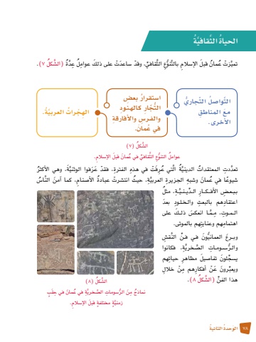 78 َ الو ُحدة ُ الثانيةَّ َة ُ ، وهي الأكثرتي عِرَف ْت ِ في هذه ِ الفترة ْ ، فقد َ عَرفوا الوثني ال َُّةَُُّ المعتقدات الدينيتعد ِدتَّسُ النا�، حيث ْ انت�شرت ُ عبادة الأ�ص ِ نام، كما َ آمن ََُّّ ِةً �شيوع ُ ا في ع َمان ِ و�شبه ِ الجزيرة العربيكل )7)َُّ ال�شُِّع َّ الث ِّ قافي ُ في ع َمان َ قبل الإ�س ِالم. عوامل التنوُكل )8)َُّ ال�شَّ ِة ُ في ع َمان ِ في حَق ٍبُّ الر�س ِ ومات ال�ص َّ خريُ نماذج ِ مَنَّ ٍة ٍ مختلفة َ قبل الإ�س ِالم.زمني الت ُّ جاريِّلُالتَّوا�صالأخرى. َمع ِ المناطقُ ا�ستقرار بع�ِضج ِار كـالهـنـ ِودالت َُّّوالفـ ِر�س ِ والأفارقةُ في ع َمان.ة. ُرات َّ العربيُِ اله ْجكل 7.)ُ)ال�شَّةُدَّل ِ عُ الث ِّ قافي ْ ، وقد �س َ اعدْت َ على ذلك ِ عوامَُِّّعَّ بالتنوُمان َ قبل الإ�س ِالم عَُّ ْزتتميةُ الث َّ قافيَّالحياةُ، مثلَُّ ِ �ةِ ب�ب�ع���ض ِ الأف���ك���ار ِّ ال�دي�ن�يِ اعتقاد ِ هم بالبعث ِ وال�خ�ل�ود َ بعدَس َ ذل��ك على �م�ا انعك�َِّ ال�م�وت ِ ، مِ اهتمام ِ هم وعنايتهم بالموتى. النق�ِشَّ ف�ي ف�نُِّّ َونَ وب��رع العمانيَّ ِة، فكانوا ُّ وال�ر��س ِ �وم�ات ال�ص َّ خريج َ لون تفا�ص َيل ِ مظاهر ِ حياتهم ي�س ِِّّ َ رون َ عْن ِ أفكار ِ هم مْن ِ خاللويعبكل 8.)ُ)ال�شَِّّ هذا الفن