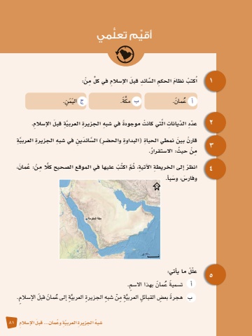 12٤ع َمان. . مكَة ِن. ََُّ َمالي5 في كل ِ م ْن:ٍُّ ْ كتب َ نظام ِ الحكم ال�سَّ ِ ائد َ قبل ِ الإ�سالماِّعدِد ِّ الد ِ يانات َّ ال ْ تي كانت ً موجودة في �ش ِبه ِ الجزيرة َّ العربيِة َ قبل ِ الإ�سالم.ْ قارن َ بين ِ نمطي الحياة ِ )البداوة والح�ض ِر( ال�سَّ َ ائد ِين في �ش ِبه ِ الجزيرة َّ العربيِةِم ْن ُ حيث: اال ُ �ستقرار.ل ِ م ْن ُ : ع َمان، ًّْ انظر ِ إلى الخريطة ِ الآتية ُ ، ثَّم ُ اكت ْب عليها في الموقع ال�صحيح كَ وفار�س، و�سَبأ.ِّعل ْل ما يأتي: ع َمان بهذا اال�س ِم.أ ت�س َمية َُّ ِة ُ إلى ع َمان َ قبل الإ�س ِالم.َّ ِة ِ مْن ِ �شبه ِ الجزيرة العربيب َ هجرة ِ بع�ض ِ القبائل العربيج أ بم تعلميِّ أقي ُّ٠ ٣٧٠ كممكة المكرمةشصفحة: ٣1٣�ش ُبه ِ اجلزيرة َّ العربيِة ُ وع 81 َ مان... قبل ِ الإ�سالم
