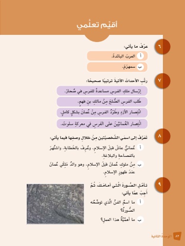 67ِّعر ْف ما يأتي:م تعلميِّ أقي ُّأ َ العرب َ البائدة.ب �س َ مهرَم.ِّرت ِب َ الأحداث َ الآتية ً ترتيبا �ص ًحيحا:ْإر�س ِ ال ملك الفر�ِس م�س ً اعدة للفر�ِس في �صُ َحار.َطلب الفر�ِس ال�صُّ َ لح ِ مْن ِ مالك ِ بن ٍ فهم. ع َمان ٍ ب�شكل ٍ كامل.ُد الفر�ِس ِ مْنُْْانِت�ص ِ ار الأزد َ وطرِ َ سلوت.ِّ َ ين ِ على الفرس في معركةِ ُ صار العمانيْانتَتَعَّر ْف َ إلى ا�سمي ال�َّشخ�صَّي ِ تين م ْن ِ خالل و�صِفها فيما يأتي:، وعِر َف َ بالخ ِ طابة ُ ، وا�شت َهرٌّ عا�َش َ قبل الإ�س ِالم ُعمانيأ ُبالف�ص ِ احة ِ والبالغة.ي ع َمان مِل َك ُ ع َمان َ قبل الإ�س ِالم ُ ، وهو والد َب ِمْن ِ ملوك َُعند ِ ظهور الإ�س ِالم.ُّص َ �ورة َّ ال�ت�ي َ أم��ام َ ��ك ُ ، ث َّ �مت� َّ أم ِ �ل ال��� عما يأتي:َ ِج ْب َّأذي تو�ضُحه ال َِِّّّ الفنمأ ما ا�سُورة؟ال�صُّ ُة ِ هذا العمل؟َُّأهميب ما ِّ8982 َ الو ُحدة الثانية