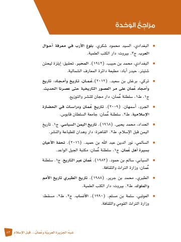 �ش ُبه ِ اجلزيرة َّ العربيِة ُ وع 83ُ مان َ ... قبل ِ الإ�سالمn البغدادي، ال�سيد محمود �شكري. بلوغ الأرب ف�ي معرفة أح�وال العرب. ج3 .بيروت: دار الكتب العلمية.n البغدادي، محمد بن حبيب. )1942 .)المحبر. تحقيق: إيلزة ليحتن �شتيتر، حيدر أباد: مطبعة دائرة المعارف ال�شمالية.n تركي، برغ�ش بن �سعيد. )2012ُ .)ع��م��ان، ت�اري�خ وأم�ج�اد: تاريخ و ُ أمجاد عمان على مر الع�صور التاريخية حتى ع�صرنا الحديث. ج1 ،ط1� ،س ُ لطنة عمان، دار مجان للن�شر والتوزيع. n الجرو، أ�سمهان. )2009 ُ .)ت�اري�خ ع�م�ان ودرا��س�ات ف�ي الح�ضارة الإ�سالمية. ط2� .س ُ لطنة عمان: جامعة ال�سلطان قابو�س. n الحداد، محمد يحيى. )1968 .)تاريخ اليمن ال�سيا�سي. ج1 .تاريخ اليمن قبل الإ�سالم. ط2 .القاهرة: دار وهدان للطباعة والن�شر.n ال�سالمي، نور الدين عبد اهلل بن حميد. )2016 .)تحفة الأعيان ب�سيرة ُ أهل عمان. ج1� ،س ُ لطنة عمان: مكتبة الجيل الواعد. n ال�سيابي، �سالم بن حمود. )1982ُ .)عمان عبر التاريخ. ج1� .سلطنة عمان: وزارة التراث والثقافة. ُn الطبري، محمد بن جرير. )1988 .)تاريخ الطبري تاريخ الأمم والملوك. ط2 .بيروت: دار الكتب العلمية. n العوتبي، �سلمة بن م�سلم. )1990 .)الأن�ساب. ج2 ،ط2 ،م�سقط: وزارة التراث القومي والثقافة.َمر ِ اج ُع َ الو ْح ِدة