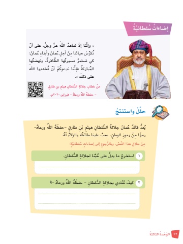 92 َ الو ْح ُدة ُ الثالثةةٌَّ لطاني �ساءات ٌُإ�ض وجل، على ْ أنَّ عزإننا ْ إذ ُ نعاهد َ اهلل ََّّ» و ع َمان؛ ع َمان و ِ أبناء َُس َ حيات ِ نا مْن ِ أجل ُن ِّكر�ُتها ها الظ ُ افرة، ونه�ضَُّ م�سيرتَُّ كي ت�ستمر ت َ عاهدوا اهللنا ندعوكْم ْ أن ُُإنَّباركة فُالمَُ على ذلك «. ُّ ِ لطان ِ هيثم ِ بن ٍ طارقْمن ِ خطاب ِ جاللة ال�سُ - حفظه ُ اهلل ُ ورعاه - فبراير،2020م.ُ اهلل ُ ورعاه- هْ ِن ٍ طارق َ -حفظُُّ ِ لطان ِ هيثم ب جاللة ال�سُ ع َمانُ قائد ُعدُّيُه. ُء َ لته والوالُ، يجب َ علينا طاعًُ رمز ِ ا مْن ِ رموز ِ الوطن َُّ ٍة:ُّ ، وبالر ِجوع إلى إ�ض ٍ اءات �سُ لطانيِّصِمْن ِ خالل َّ هذا الن�حل ْل ْ وا�ستنتجِّ.........................................................................................................................................................................................................................................................................................................ُّ ِ لطان.ِّ ِ نا لجاللة ال�س ما يدل ُ على حبُّ1 ْ ا�ستخرجُ اهلل ُ ورعاه -؟هُّ ِ لطان َ - حفظُ2 َ كيف َ نْق ِ تدي بجاللة ال�س