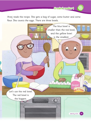 Areej reads the recipe. She gets a bag o