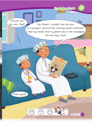 Graded reader 2 2 Did you win the race, Dad? No, Khalid. I couldn’t win the race in a penguin costume! But winning wasn’t important. I had my medal. And my photo was in the newspaper the next day. Loo! That’s great! fifty-seven 57