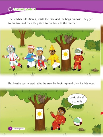 But Hazim sees a squirrel in the tree. He loo s up and then he alls over.