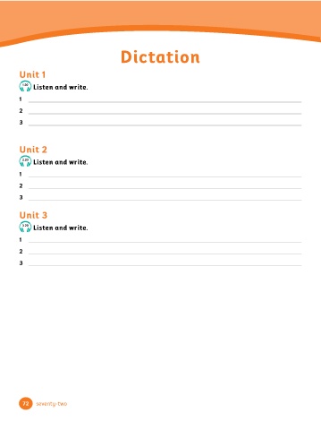 Dictation Dictation Unit 1 Unit 1 1.20 Listen and write. 1 2 3 Unit 2 Unit 2 2.20 Listen and write. 1 2 3 Unit 3 Unit 3 Listen and write. 3.20 1 2 3 72 seventy-two