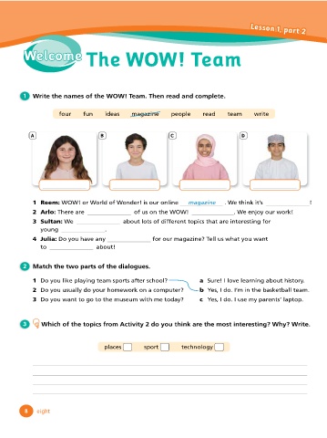 1 Write the names of the WOW! Team. Then read and complete.
