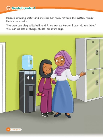 Huda is drin ing water and she sees her mum. ‘What’s the matter, Huda?’
