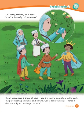 Then Hassan sees a group o boys. They are putting on a show in the par .