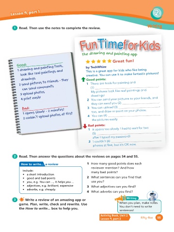2 Read. Then answer the questions about the reviews on pages 54 and 55.