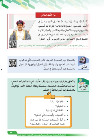 99ُ االقتصاد ُ الع ُّ ماني ُ : سوق ِ العمل َّ والمؤس ُسات َّ الص ُ غيرة ِّ والمتوس ُطةِّ ْصلخِ ُهَّ ْ تي قد تواجَّ ِّحد ِ يات الِّص التِ ِ االستجابة َّ الس ِ ريعة، لخِ ِ االست ِ عانة برمزبْضَِّم اعرُِ ِ لمواجهتها، ثَ الحلولَ ْ ، وأب َرزَ ِّ والمتوسطةَّ المؤس ِ سات َّ الصغيرةَ َّ في الص ِّف.ِكْ َت ِ إليه َ أمام زمالئَّ ما توصلُّ ِطق ّ الساميِم َن النَّ َ ذين يرغبون في األعمال الُ ُ ورائدات ُِ ُ نا رّوادُنا وبناتَّ \أما أبناؤَّ َ نا عازمون ِ على األخذ ِ بأيديهم، ِ َّ م الخاصِة؛ فإنِ تأسيس َ م ِ شاريعهِ ِ الالزمةِ، والحوافزِ َّ الدعم األعمال، وتقديمِ ِ يادة ِِ رَ ِرامجِ بَ ْشجيعوتِ ِّ ها المحوري في َّ للمؤس ِ سات َّ الص ِ غيرة ِّ والمتوس ِطة ً ؛ نظرا لدورَر ِص َ العَم ِل\.ُِ َ الم ِزيد من فَّ ِة، وتوفيرِ تنشيط ِ الحركة االقتصاديُ- يناير، ٢0٢٢م.َّ ُه ورعاهِ ُ - حفظه اللَّم طارق المعظِ ٍِ بنِ هيثم صاحب ِ الجاللة ُّ السلطانِ من خطاب ِ حضرة ُِ َ معَّ الربطِ الحياة أصحاب أحد ًِ َ مع ِِ مقابلةَ، أجرِمكَِّ ِ ، وبإشراف معلِكِ َ مع ِ أفراد َ مجموعتَّ ُ عاونبالتْضِم اعرَُِّة ِ اآلتية، ثَِ ِ طاقة المقابلًا ببِ ِّ والمتوس ِطة، مستعينَّ المؤس ِ سات َّ الصغيرةَ َّ في الص ِّف.ِكْ َت ِ إليه َ أمام زمالئَّ ما توصلَ؟َ َّس َسِتكُ ُ مؤَرةْ ما فك▪ ُِها؟▪ ما تصنيفُها؟َ ْهِدفَ ْستُ َّ التي تَةْئ▪ ما الفَ ِّد ُمها؟ُقِخ ْد ُ مات َّ التي تَْ ُ جات والْتُمنْ▪ ما الَ ِةَ ْ من هيئَّ ِ سهيالت َّ المقد ِمة لكُ الت▪ ما أبرزِ تنمية َّ المؤس ِ سات َّ الص ِ غيرة ِّ والمتوس ِطة؟