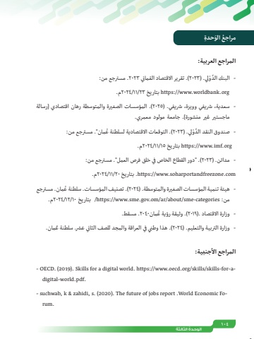 104ُ الوحدة الثالثةُِ مراجع َ الوحدةالمراجع العربية:- َّ البنك الد ْولي. )٢0٢٣ .) ُ تقرير االقتصاد العماني ٢0٢٣ .مسترجع من: org.worldbank.www://https بتاريخ ٢٣/11/٢0٢٤م.- سعدية، شريفي وويزة، شريفي. )٢0٢٥ .)المؤسسات الصغيرة والمتوسطة رهان اقتصادي ]رسالة ماجستير غير منشورة[. جامعة مولود معمري.- َّ صندوق النقد الد ْولي. )٢0٢٣ .) ُ التوقعات االقتصادية لسلطنة عمان\. مسترجع من: org.imf.www://https بتاريخ 1٥/11/٢0٢٤م.- مدائن. )٢0٢٣\ .)دور القطاع الخاص في خلق فرص العمل\. مسترجع من:com.soharportandfreezone.www://https .بتاريخ ٢0/11/٢0٢٤م. - هيئة تنمية المؤسسات الصغيرة والمتوسطة. )٢0٢٤ .) ُ تصنيف المؤسسات. سلطنة عمان. مسترجع من: categories-sme/about/ar/om.gov.sme.www://https /بتاريخ 10/1٢/٢0٢٤م.- وزارة االقتصاد .)٢019 .) ُ وثيقة رؤية عمان٢0٤0 .مسقط.- وزارة التربية والتعليم. )٢0٢٤ .) ُ هذا وطني في العراقة والمجد للصف الثاني عشر. سلطنة عمان.المراجع األجنبية:.pdf.world-digital,a-for-skills/skills/org.oecd.www://https. world digital a for Skills(. 2019. )OECD- .rum,Fo Economic World .report jobs of future The(. 2020. )s, zahidi & k, suchwab-