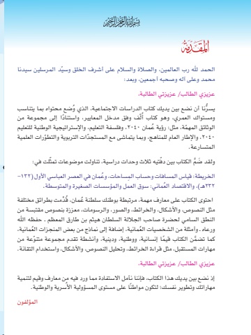 ّ الحمد هلل رب العالمين، والصالة والسالم على أشرف الخلق وسيد المرسلين سيدنا محمد وعلى آله وصحبه أجمعين، وبعد:عزيزي الطالب/ عزيزتي الطالبة،ُ نا أن نضع بين يديك كتاب الدراسات االجتماعية، الذي وضع محتواه بما يتناسب يسرُُّّل ً ف وفق مدخل المعايير، واستنادا إلى مجموعة من ومستواك العمري، وهو كتاب أّ الوثائق المهم ُ ة، مثل: رؤية عمان 2040 ،وفلسفة التعليم، واإلستراتيجية الوطنية للتعليم 2040 ، ّ واإلطار العام للمناهج، وبما يتماشى مع المستجد ّ ات التربوية والتطورات العلمية المتسارعة.م ّ الكتاب بين دف ّ تيه ثالث وحدات دراسية، تناولت موضوعات تمثلت في: َ ولقد ضَِّ الخريطة: قياس المسافات وحساب الم ُ ساحات، وعمان في العصر العباسي األول )132 -232 ُ هـ(، واالقتصاد العماني: سوق العمل والمؤسسات الصغيرة والمتوسطة.دمت بطرائق مختلفة مان، قُُِّ احتوى الكتاب على معارف مهمة، مرتبطة بوطنك سلطنة عمثل النصوص، واألشكال، والخرائط، والصور، والرسومات، معززة بنصوص مقتبسة من النطق السامي لحضرة صاحب الجاللة السلطان هيثم بن طارق المعظم ـ حفظه اهلل ُ ورعاه ـ وأمثلة من الشخصيات الع ُ مانية، إضافة إلى نماذج من بعض المنجزات العمانية، َّ كما تضم ً ن الكتاب قيم ّ ا إنسانية، ووطنية، ودينية، وأنشطة تقدم مجموعة متنوعة من مهارات المستقبل، مثل قراءة الخرائط، وتحليل النصوص، واألشكال، واستخدام التقانة.عزيزي الطالب/ عزيزتي الطالبة،إذ نضع بين يديك هذا الكتاب، فإننا نأمل االستفادة مما ورد فيه من معارف وقيم لتنمية سرية والوطنية.ًُ مهاراتك وتطوير نفسك؛ لتكون مواطنا على مستوى المسؤولية األالمؤلفون