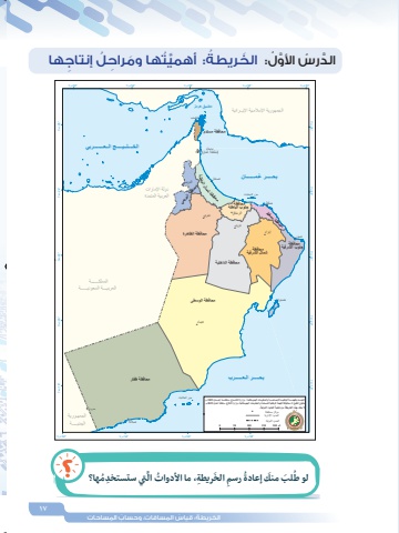 17ُ الخريطة ُ : قياس ِ المسافات ُ ، وحساب ِ الم ِ ساحاتَ الخ ُ ريطة َّ : أهمي ُت َ ها وم ِ راح ُل َّ الد ُ رس َّ األو ِ إنتاجها ُل:!!!!!!!!!!!المملكـــــــةالعربیــــة السعودیــــــةالجمھوریة الإسلامـیة الإیــرانیةالجمھـوریةمدحاء(سلطنة عُمان)جزر الدیمانیاتمصیرةجزر الحلانیاتالیمنیـــــةحبروتدولة الإماراتالعربیة المتحدةمحافظة البریميمحافظة الداخلیةمحافظة الظاھرةمحافظة الوسطىمحافظة جنوب الباطنةمحافظة جنوب الشرقیةشمال الشرقیة محافظةمحافظة مسقطمحافظة مسندممحافظة ظفارة نط ابلال ماش ةظ فحا مصورمسقطخصبصحارعبرينزوىإبراءصلالةھیماءالبریميالرستاقبحـــــر عُـمـــــــانمضـیق ھرمزالخــــلــیـــــج الــعــــــــربيبحـــــر الـعــــــرب°24° 18° 20° 22° 26°18° 20° 22° 24° 26سلطنــــــة عُمــــــان°60 شرقاً °58 شرقاً °56 شرقاً °54 شرقاً °52شرقاً°58° 56° 54° 52(النطاق الإداري ومراكز المحافظات)لا یعتد بھذه الخریطة من ناحیة الحدود الدولیة .كم 200 150 100 50 0الحدود الإداریةمركز محافظة !الحدود الدولیةشرقاً شرقاً شرقاً شرقاً شمالاً شمالاً شمالاً شمالاً شمالاًشمالاً شمالاً شمالاً شمالاً شمالاًأنتجـــت بالھیئــــة الوطنیـــة للمساحـــــة والمعلومات الجیومكانیة ، وزارة الدفـــــاع، سلطنــــة عُمــــان2025 م .حقوق الطبع © محفوظة للھیئة الوطنیة للمساحة والمعلومات الجیومكانیة، وزارة الدفاع، سلطنة عُمان 2025 م .َّ ِ تي ستستخد ُمها؟َ ِ ريطة ُ ، ما األدوات الِ الخُ رسمُ َ لب منكَ إعادةلو ط