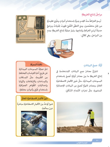 20ُ الوحدة األولىً ُ : جمع ِ البياناتَّ أواًلِ ِ البيانات ُ الم ْس َ تخد ِمة في َّ تتنو ُع ُ مصادر جمعُِ ُ جمع باستخدامَّ ٍة تِ ِ الخريطة َ ما بين َ مصادر أوليإنتاجَّ ِةِ االصطناعيِ األقمارُ ُ صَورَّ ِة، مثلِ المسوحات الميدانيَّ ِة م ِ ن البيانات اإلحصائيُ ُ جمع َِّ ٍة تِّ الخام َ ، ومصادر ثانويّانيِّ.َّ ِ عداد ُّ السكُ ِ نشرات التِ المنشورة، مثلِ ِ الخريطةُ إنتاجِ مراحلَّ ٍةُ ٍرق تقليديِ ٍ أدوات وطًّا باستخدامِ يدوي القدمُ ُِ منذُ ُ رسم الخرائط تُّ ٌ ات وبرامجِيْنِقِّ ْ ظهرت تْنيِّقِ التُّ التطورَ ِل ِّ متخص َصين َ ، ومعِبِن قمـِ ِ الخريطة ٍ بعددُ إنتاجَّةِ ِ الخرائط ِ وإنتاج ُّ ها، وتمر عمليٌ ْ لرسمحديثة المراحل، وهي كاآلتي:ِم َن ُِ ِ المعرفةنافذةُ ِ المسوحات َّ الميدانيِةُّ تتم َّ عملية أخذ ِ القياسات ُ الم ِ ختلفةِ َِعن طريقُ َ الم ِ سافاتَّ ِ بيعة، مثلِمن الطِ والم ِ ساحات ِ واالرتفاعات ّ والزوايا ِ َّ الجغرافيِةَّواهرّ وإحداثي ِ ات الظ مختلفة.ُ ُرٍق ٍ وأدوات ٍِ طباستخدامِ ااًل َّ صطناعيِة ُّ الخامُصَوُر األقمارًِ َّ االصطناعيِة مباشرة م َن األقمارُ ُِؤخذُص ٌور تَ ٍجة.َ دون معال