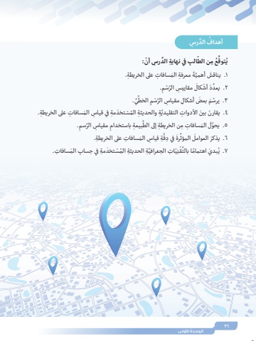 26ُ الوحدة األولىرسُ َّ الد ِ أهدافالب ِ في نهاية َّ الد ِرس ْ أن:ّ ِ من الطَّ ُع ُِتوقيَ ِ معرفة َ الم ِ سافات ِ على الخريطة.َّة1 . َ يناقش أهمي.َِ ِ مقاييس َّ الرْسمْ كال2 . ِّ يعد َد أشِّي.ِِّ الخط أشكال ِ مقياس َّ الرْسم3 . ُ يرس َم َ بعض َِّ ِة ِ والحديثة ُ الم ْس َ تخد ِمة ِ في قياس َ الم ِ سافات ِ على الخريطة.4 . َ يقارن َ بين ِ األدوات التقليدي.ِِ ِ مقياس َّ الرسمَّ ِ بيعة باستخدام م ِ ن الخريطة إلى الطَ َ الم ِ سافات ِ5 . ِّ يحولِة ِ قياس َ الم ِ سافات ِ على الخريطة.ََّ ِ في دقِّرةَ المؤث٦ . َ يذكر العواملَّ ِة ِ الحديثة ُ الم ْس َ تخد ِمة ِ في ح ِ ساب َ الم ِ سافات.ّ ِ ات الجغرافيِيْنِّقُ َ بدي ً اهتماما بالت٧ .ي