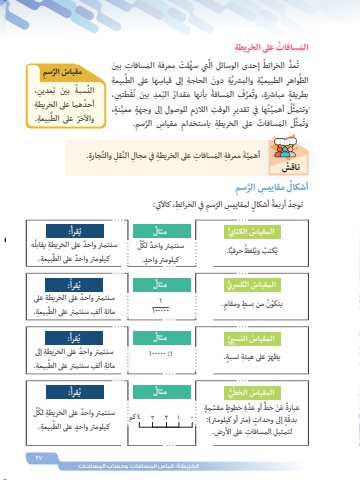 27ُ الخريطة ُ : قياس ِ المسافات ُ ، وحساب ِ الم ِ ساحاتُِ ِ مقاييس َّ الرسمأشكالِ ِ في الخرائط، كاآلتي: أشكال ِ لمقاييس َّ الرسمُ ٍُ توجد أربعةَ الم ُ سافات ِ على الخريطةَّ َّ تي سه ْ لت َ معرفة الم ِ سافات َ بينِ ِ حدى الوسائل الُ إعد الخرائطُ ُّ تَّ ِ بيعةَّ ِة َ دون ِ الحاجة ِ إلى قياسها على الطَّ ِة والبشريِ الطبيعيَّواهرالظِ، ْطتينُقُ ِعد َ بين نُ ُ بأنها مقدار البُف َ المسافةُ َّعرٍ بطريقة ٍ مباشرة، وتَّ ٍنة، للوصول ٍ إلى وجهة معيِ ِِ ِ الوقت الالزمُها في تقديرَّتُ أهميَّلْوتتمث.ِِ ِ مقياس َّ الرسمُ َ الم ُ سافات ِ على الخريطة باستخدامَّلُمثوتِّ ِ جارة. ْ ناقشَّ ِقل والتَ ِ معرفة َ الم ِ سافات ِ على الخريطة ِ في مجال النَّةأهميُِ مقياس َّ الرسمُ المقياس الكتابيُّيِ ُُّ المقياس الكسرُِّيُ المقياس النسبيُُِّّ المقياس الخطٌمثالٌمثالٌمثالٌمثال:ُُقرأي:ُُقرأي:ُُقرأي:ُُقرأيِ، ُعدينُ َ بين بِّسبةالنُ أحد ِ هما على الخريطةَّ ِ بيعة.ُ واآلخر على الطًّا.ُ حرفيُلفظُ ُ كتب ويي.ٍَّ يتكو ُن ٍ من بسط ومقامُ يظهر ِ على هيئة ٍ نسبة.ٍّ َّ أو عدِة ٍ خطوط َّ مقس ٍمةٌ َ ع ْن خطعبارةٍة ٍ إلى وحدات )متر أو كيلومتر(؛ ّبدق على األرض. لتمثيل ِ المسافات ُِِِّلٌ سنتمتر واحد لكٍ كيلومتر واحد.ـــــــــــــــــ 11000001 :100000ُه ٌ سنتمتر واحد ِ على الخريطة يقابلَّ ِ بيعة.ٌ كيلومتر واحد على الطٌ سنتمتر واحد ِ على الخريطة على َّ ِ بيعة.ِ مائة ِ ألف سنتمتر على الطٌ سنتمتر واحد ِ على الخريطة إلى َّ ِ بيعة.ِ مائة ِ ألف سنتمتر على الطِّ ُلٌ سنتمتر واحد ِ على الخريطة لكَّ ِ بيعة.ٍ كيلومتر واحد على الط0 1 2 3 4كم