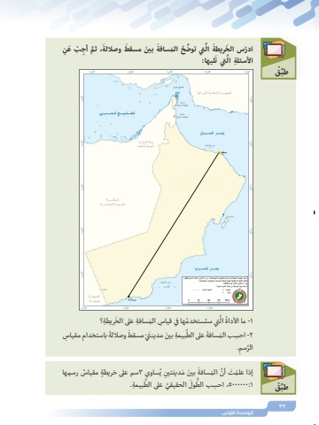 32ُ الوحدة األولىِِ ْب َ عنَ َّ ، ثم أجَ وصالةَ َ بين مسقطتي توض ُح َ المسافةَّ َِّ الَريطةُ ادرس الخَليها:تي تَّاألسئلة الَِ ِ ريطة؟َّ ُ تي ستستخدم ِ ها في قياس َ الم ِ سافة على الخُ ال1 -ما األداةِ ِ مقياسَ باستخدامَ وصاللةْ مسقطَيَّ ِ بيعة َ بين مدينتَ على الط احس َب المسافة2ِ -.َِّ الرسمصاللةِّ ْقطبِّ ْقطبُساوي 3 ٍ سم على خريطة ُ مقياس ِ رسمها ِ يَ َ بين َ مدينتينْ إذا علم َت َّ أن َ المسافةَّ ِ بيعة.َ َّ الحقيقي على الطولُّ1:5000000 ، ِ احسب الط