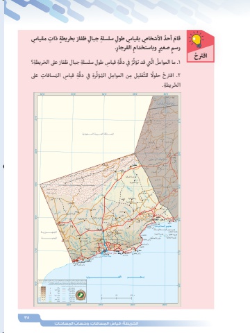 35ُ الخريطة ُ : قياس ِ المسافات ُ ، وحساب ِ الم ِ ساحاتِ َ ظفار ٍ بخريطة ِ ذات ِ مقياس سلسلة جبالِ َِ قام ُ أحد ِ األشخاص ِ بقياس طول.ِِ الفرجارٍ وباستخدامٍ صغيررسم جبال َ ظفار ِ على الخريطة؟ سلسلة ِ طول ِِة ِ قياس َُِّر في دقَِّّتي قد تؤثُ ال1 .ما العواملِة ِ قياس َ الم ِ سافات على َِّّ ِرة في دق م ِ ن العوام ِل ُ المؤثَّ ِ قليل ًِ للت2 . ْ اقترح حلوالَ ِ ريطة. الخْ اقترح