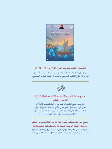 2ل َف هذا الكتاب بموجب القرار الوزاري 252 /2024مُِّأُ مانالهوية الترويجية الموحدة لسلطنة عom.gov.moe.wwwتم إدخال البيانات والتدقيق اللغوي والرسم والتصميم واإلخراج في مركز إنتاج الكتاب المدرسي بالمديرية العامة لتطوير المناهج.جميع حقوق الطبع والتأليف والنشر محفوظة لوزارة التربية والتعليمً وال يجوز طبع الكتاب أو تصويره أو إعادة نسخه كامال أو ً أو ترجمته أو تخزينه في نطاق استعادة المعلومات بأي مجزأشكل من األشكال إال بإذن كتابي مسبق من الوزارة، وفي حال االقتباس القصير يجب ذكر المصدر.ُ جميع خرائط سلطنة عمان الواردة في الكتاب تم مراجعتها من قبل الهيئة الوطنية للمساحة والمعلومات الجيومكانية ال يعتمد على الخرائط الواردة في الكتاب كمرجع للحدود الدولية والسياسية واإلدارية، والخرائط التاريخية لالستخدام التعليمي فقط.