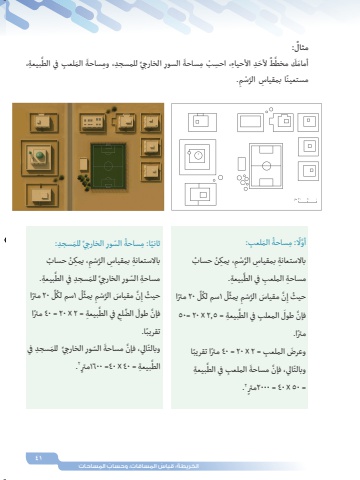 41ُ الخريطة ُ : قياس ِ المسافات ُ ، وحساب ِ الم ِ ساحاتٌ :مثالَّ ِ بيعة، لعب في الطَ َ الم ِِساحةِ الخارجيِّ ِ للمسجد، ومَ السور مساحةٌ َ ألح ِد ِ األحياء ِ ، احس ْب َِّطَ أمامكَ مخط.ًِ ِ ا بمقياس َّ الرْسممستعينلعب:ُ َ الم ًِ ِ : مساحةَّأوالِ ِ ، يمك ُن ُ حسابِ باالستعانة ِ بمقياس َّ الرْسمَّ ِ بيعة. الملعب في الطِ مساحة ِِّ 20 ً مترا ُلُ 1سم لكِّلِ يمثَّن َ مقياس َّ الرْسمُِ حيث إَّ ِ بيعة = 5,2 X 20= 50 المعلب في الطَ َِّ فإن طولًمترا. ًا الملعب = 2 X 20 = 40 ً مترا تقريبَ وعرض َِّ ِ بيعة الملعب في الطَ ِّ َّ الي، فإن مساحةوبالت.2ٍ= 50 X 40 = 2000مترِ الخارجيِّ َ للم ِ سجد:ُ ّ السورثانيً ِ ا: مساحةِ ِ ، يمك ُن ُ حسابِ باالستعانة ِ بمقياس َّ الرْسمَّ ِ بيعة. ِ الخارجيِّ َ للم ِ سجد في الطِ مساحة ّ السورِّ 20 ً متراُلُ 1سم لكِّلِ يمثَّن َ مقياس َّ الرْسمُِ حيث إَّ ِ بيعة = 2 X 20 = 40 ً مترا ِ في الطَ ِّ الضلعَّ فإن طولًا.تقريبِ الخارجيِّ َ للم ِ سجد في َ ّ السورّ َّ الي، فإن مساحةوبالت.2ٍَّ ِ بيعة = 40 X 40 =1٦00مترالط