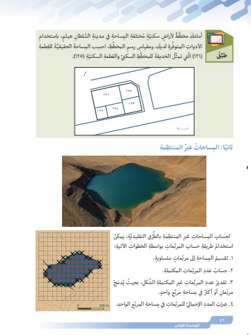 42ُ الوحدة األولىَّ ِة ُ ، يمكنُرِق التقليديُّ المنتظ ِمة بالطِ ِ الم ِ ساحات غير لح ِ ساب َِِّ ِ عات ِ بواسطة ِ الخطوات ِ اآلتية: حساب المربُ استخدام ِ طريقة َِّ ٍ عات ٍ متساوية. الم ِ ساحة إلى مرب1 . ُ تقسيم ِ المكتملة.َّ ِ عات ِ عدد المرب2 . ِ ح ُ ساب ُُِ َدمج المكتملة َّ الش ِكل ُ ، بحيث يِ َِّ ِ عات غير عدد المرب3 . ُ تقدير ٍِ ٍ واحد.َّعِ ْ أو ُ أكثر ِ في م ِ ساحة مربَّعانمربِ ِ الواحد.َّعَّ ِ عات ِ في م ِ ساحة المرب العدد اإلجماليِّ للمرب4 . ْ ضر ُب ٍِِ، باستخدامَمِ هيث الم ِ ساحة ِ في مدينة ُّ السلطانَّ ٍة ُ م ِ ختلفة ِ ألراض سكنيٌ ٍَّطَ مخطَ أمامك للق ِ طعةَ َِّةَ الحقيقيِط ِ ، احس ِ ب المساحةَِّ المخطِّ ِرة لديكَ ِ ، ومقياس رسمِ األدوات المتوفَّ ِة )125.)ِّ ِ والقطعة السكنيِط السكنيََّ للمخطُ َ الحديقةِّلَّتي تمثِّ ْق )121 )الطب1251211221231241:2000 المنتظ ِمةا: الم ُ ساحات ُ غير ًِ ِثاني