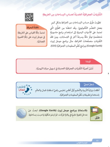 44ُ الوحدة األولىِ جوجل إيرث )Earth Google ْ ،)ابحث ْ عنبااًل ِ ستعانة ببرنامجَها. م َساحتَ ِ ها واحس ْب َِّ َّ ات، ثم ُ ارس ْم شكلٍ ِ ( في والية قريَِة ْ نجمَم ِ دخل َ )هويِّ ْقطبٍ بشكل كبير م ِ ن الخرائط ٍ الم ِ ساحات ِ حساب ُِ ُرق ِ َّ تطو ْرت طَّتي ُرِق الُّْ ِ نا من الطَد انتقلْنولوجيِّ، وقِّكِ التبفضل ُّ التقدمَِّ ٍةَ حاسوبيِ برامجِخدامّْ ِة إلى استُ تعتمد ِ على األدوات اليدويَِ ْن تلكً َ أكبر ِ في الح ِ سابات، ومً وسرعةَّةُر دقُِّم ِّ تخص ٍصة توفِ جوجل إيرث ُ برنامجَ ِ رائط، مثلِّ ُ حات الخّ ِ ات متصفِيْنِّقالتَّ ِة )GIS.)ِ ِ المعلومات الجغرافيُمُظِ ن)Earth Google )وبرامجِ ُيمناقَّ ِة.ِنا اليوميَّ ِة ِ الحديثة ِ في تسهيل حياتّ ِ ات الجغرافيِيْنِّقَ التَّةُ ِّثم ُن أهمينُ ِ المعرفةنافذةَ ِ ريطةُ ِ القياس على الخَّة دقُ تعتمد ِِة ّ الص ِ ورةَِّ في جوجل إيرث على دقَّ ِة. الفضائيُم َ نج ٌز ُ عمانيٌَِّمُ َ مان والعال لسلطنة عَ ٍ أطلس ٍّ تعليمي رقمي ِِ َّ أولَّعليمَّ ِ ربية والتُ التْ أطلقت َ وزارةَّ ِة.ِ ِ المعلومات الجغرافيُمُظِ ِ تطبيقات نباستخدام م ِ ن الخريطة الم ِ ساحات ِ لحساب ُِ ُِ َ الحديثةِ ّي ُ ات َّ الجغرافيةنْقِّالت