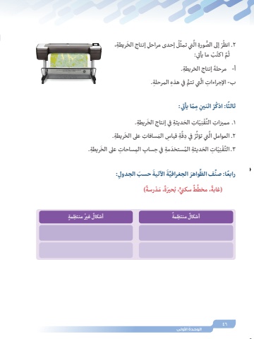 46ُ الوحدة األولى م ّما يأتي: اثنين ُِ ْر ًِا: اذكثالثَ ِ ريطة.ِ الخّ ِ ات َ الح ِ ديثة في إنتاجِيْنِّق1 ِ .مميزات التَ ِ ريطة.ِة ِ قياس َ الم ِ سافات على الخَُّر ِ في دقَِّّتي تؤثالعوامل ال2ِ .َ ِ ريطة. الم ِ ساحات على الخّ ِ ات َ الح ِ ديثة ُ الم َ ستخد ِمة ِ في ح ِ ساب ِِيْنِّق3.التِ:َ َ حسب الجدولَ اآلتيةَّ َ واهر َّ الجغرافيةف الظًِّ رابعا: صن(ٌْرسةٌ َ ، مدُ َحيرةٌّ، بٌ سكنيَّطٌ، مخط )غابةٌ منتظمةٌ ِ منتظ ٍمة أشكالٌ ُ غير ِأشكالَ ِ ريطة، ِ الخ إحدى مراحل إنتاجُ ِِّلَّتي تمثُّ إلى الص ِ ورة الْرُ2 .انظُ ْب ما يأتي:َّم اكتُثِ ِ الخريطة.َ إنتاجأ- مرحلةَّ ُّ تي تتم ِ في هذه ِ المرحلة.ِ ب- اإلجراءات ال
