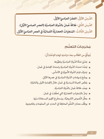 التعل ِمُُّم َخر ُ جاتَ ْن: ِِه ِ لهذه َ الو ْح َدِة أالب َ بعد َ دراستّ َِّ ُع من الطُتوقيَّ ِة ُّ وتطوَرها.َ َّ الد ِولة ّ العباسيَ َّ تتب َع نشأةيُ َ مان. َّ ِة َ وامتداد ِ اإلمامة في عحد َد َ امتداد َّ الد ِولة ّ العباسيُ ِّيِس.َُّ ِة في األندلُمويَف َ قيام َّ الد ِولة األَ َّ تعريِ َّ ها األو ِل.َّ ِة في عصريوض َح ِ إسهامات َّ الد ِولة ّ العباسيَِّّ ِة(.َ ِ )اإلمامة األولى والثانيُ َ مان خاللَ في عَّةَ ِّ السياسيِّ َص الحياةيلخَّ ِة. ُ َ مان َّ بالد ِولة َ العّباسيَ عِ يصَف َ عالقةُ َ مان.َّ ْ قت في عَّ ِة التي تحقَ َّعتز ُ بالم َنج ِ زات َ الحضارييْها.َ من القيَ َم َ المستفادةِ َج ِْرَستخَ، ويَّةّ ِ اريخيُّ َ صوص التَ النلِّيحلِ ِ المعلومات ِ وتلخيصها.َ ِ في البحث َ عنِفةِ المختلمَُّّعل مصاد َر التَِّف ِيوظُ .ُّ َّ األولُ : َ الع ْصُر ّ العباسيَّ األولَّ الد ُرسِ(.ِّ َّ األولِ العباسيُ ُ ع َ مان َّ بالد ِ ولة ّ العب َّ اسيِة )العصراني: َعالقةََّّ الد ُرس الثِ.ولََِّّ األِ ّ العباسيُ في العصرُ ُ الع َّ مانيةَّةَّ ُ الث: ُ الم َ نج ُ زات الحضاريَّ الد ُرس الث50ُ الوحدة ُ الثانية